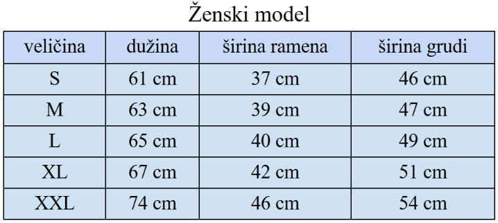 Izaberite veličinu majice (muška ili ženska) prema tabeli za mušku majicu (kliknite ovde) ili žensku majicu (kliknite ovde).